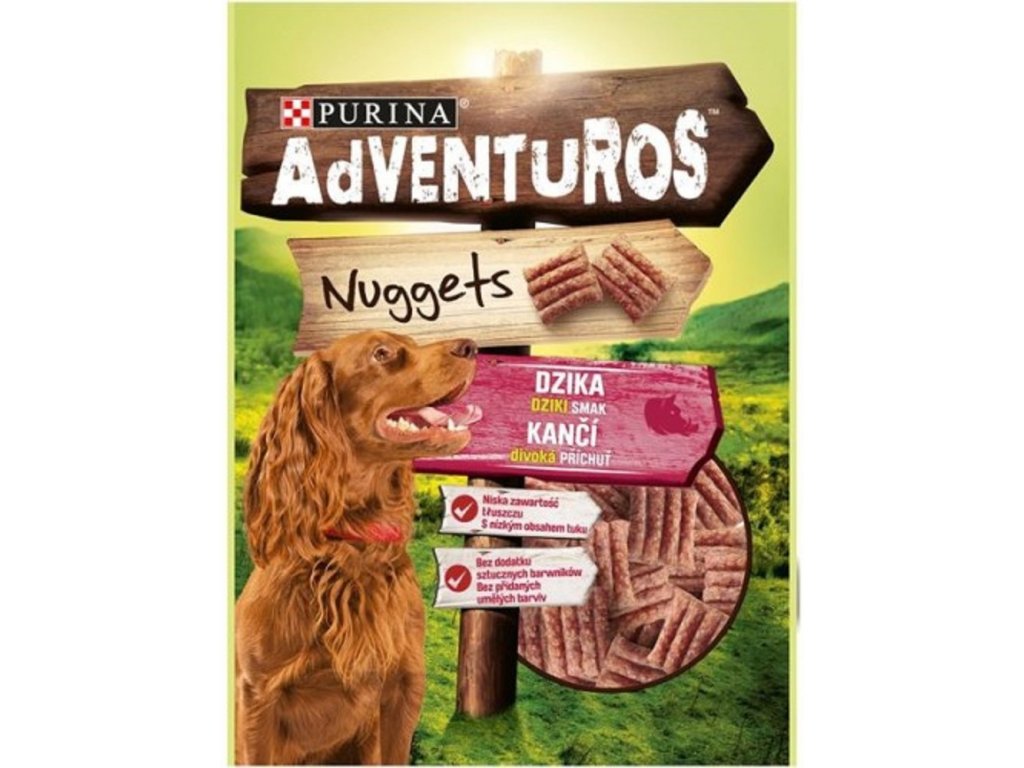 Adventuros Nuggets jsou doplňkovým krmivem ve formě malých pamlsků s kančí příchutí určených pro dospělé psy. Nugetky jsou skvělou malou odměnou pro psa pohybujícího se doma i venku.