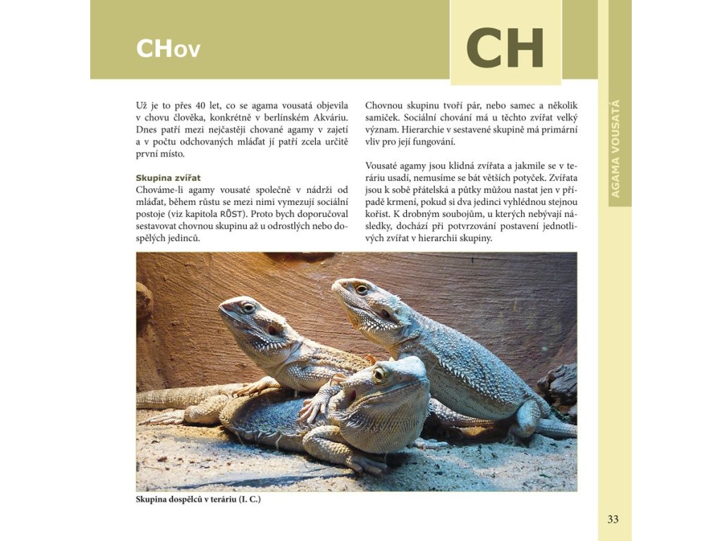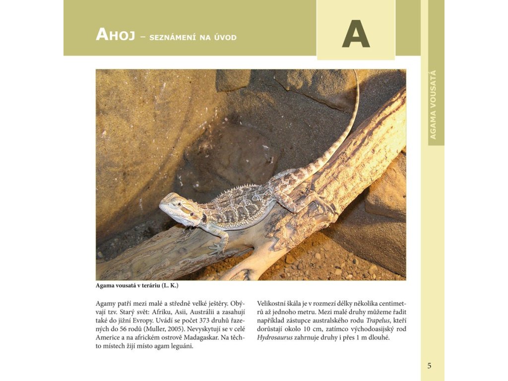 Agama vousatá je velmi oblíbený druh pouštní agamy. Po zajištění základních podmínek pro chov (vhodná velikost terária, zdroj tepla a UV záření) se hodí i pro začínající chovatele. V této knížce najdete vše, co potřebujete znát k zajištění základních životních potřeb tohoto velmi pěkného a komunikativního zvířete. Kniha je přehledně rozdělena do kapitol, je zde věnována pozornost základní péči, rozmnožování, chovu mláďat, možným komplikacím v chovu, vztahu k člověku, biologii druhu atd... Své si zde najdou začátečníci i zkušení chovatelé.