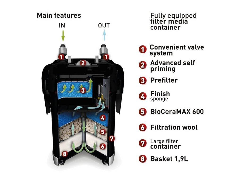 ULTRAMAX je technicky pokročilý kanystrový filtr s patentovaným řešením, které zaručí jedinečnou ergonomii používání. , zajišťuje ideální čistotu vody a její parametry v každém i v tom nejnáročnějším akváriu. Použitý předfiltr omezuje četnost čištění vložek a umístění v krytu umožňuje jeho výměnu bez vyjímání filtru ze skříňky.