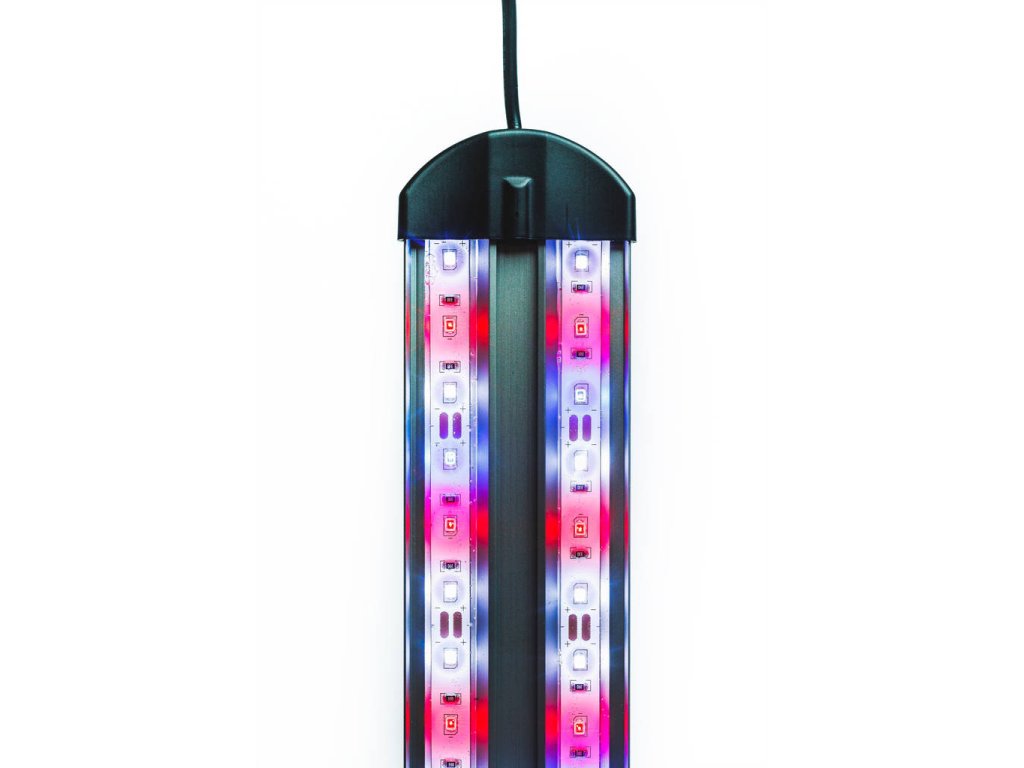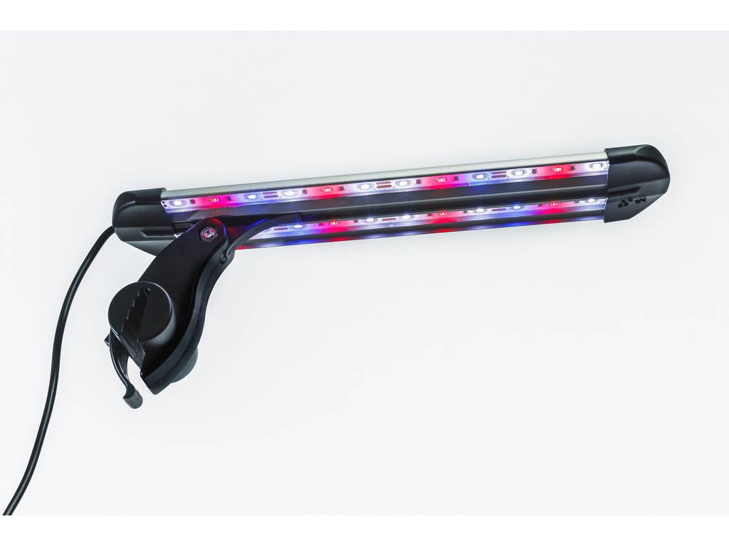Elegantní LED osvětlení k uchycení na stěnu akvária. Pomocí univerzálního kloubového držáku jej můžete nasadit na různé síly skla a regulovat úhel dopadu světelných paprsků. Voděodolné provedení umožnuje osvětlení umístit přímo nad vodní hladinu. voděodolné silikonové ledky barevné spektrum LED diod - bíla, červená, modrá lze nastavit úhel dopadu světla.