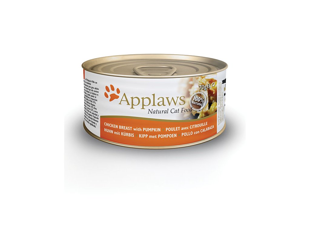 Applaws konzerva Cat 70g KUŘECÍ PRSA A DÝNĚ je přírodní doplňkové krmivo pro kočky. Dýně je skvělým zdrojem vlákniny a podporuje zdravé trávení. 100 % přírodní krmivo bez umělých konzervačních látek, barviv nebo dochucovadel.Applaws konzervy pro kočky obsahují pouze z kvalitní a přírodní suroviny. Použité kuřecí maso pochází z chovů, v nichž jsou kuřata krmena přirozeně a nejsou do krmiva přidávány hormony. Ryby, jejichž maso je použito v krmivu, byly loveny ve volné přírodě.