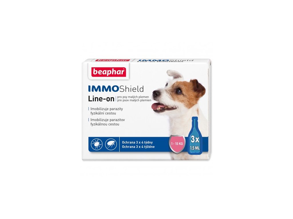 Pro psy o hmotnosti 1-15 kg. Každá pipeta působí 4 týdny. IMMO Shield Line-on, je přípravek založený na látce dimetikon (silikonový olej), který imobilizuje blechy, klíšťata a veškerý ostatní hmyz, zejména komáry, roztoče, vši a všenky fyzikálním způsobem. Dimetikon vytváří na hmyzu povrchovou vrstvu, která inhibuje jejich klouby a působí jako lepivá past. Dimetikon působí na všechna vývojová stadia blech. Návod k použití: obsah jedné pipety naneste přímo na kůži podél páteře zvířete od krku po ocas. Aplikaci opakujte každé čtyři týdny nebo po koupeli. Pro optimální ochranu zvíře nejprve ošetřete sprejem IMMO Shield. Složení: dimetikon (standard CAS № 68937-54-2) 474 g / l, aloe vera (standard CAS № 94349-62-9) 5 g / l, parfém 10 g / l.