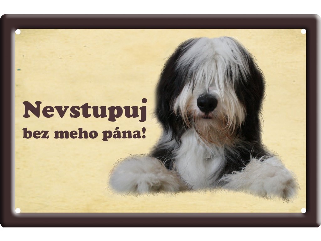 Plechová psí cedulka pro venkovní i vnitřní použití v rozměru 150x100mm, v rozích 4 díry pro uchycení, prolisovaný zdobný okraj tabulky, potištěný plech.