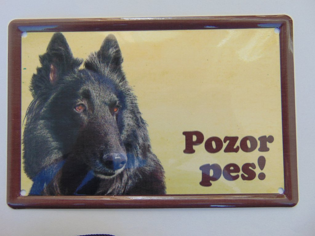 Plechová psí cedulka pro venkovní i vnitřní použití v rozměru 150x100mm, v rozích 4 díry pro uchycení, prolisovaný zdobný okraj tabulky, potištěný plech.