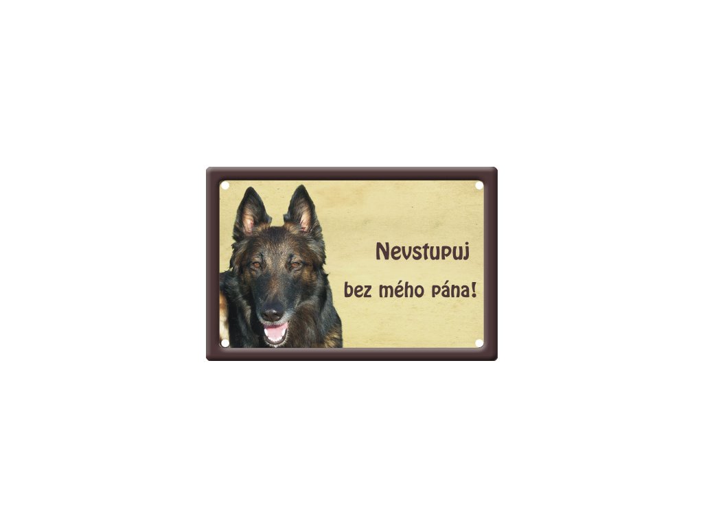 Plechová psí cedulka pro venkovní i vnitřní použití v rozměru 150x100mm, v rozích 4 díry pro uchycení, prolisovaný zdobný okraj tabulky, potištěný plech.