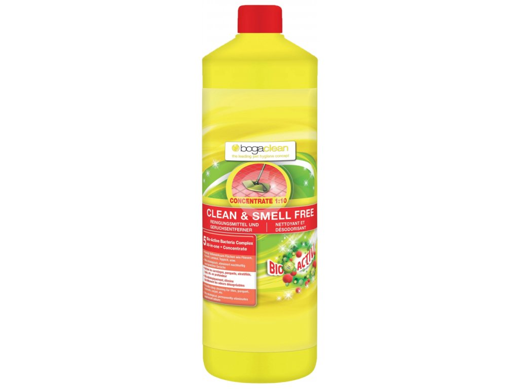 Nepříjemný zápach vzniká při odbourávání organického materiálu bakteriemi. Tím vznikají zapáchající plyny, sloučeniny síry a amoniak (trus, moč, zvratky, značkování, inkontinence atd.). bogaclean CLEAN & SMELL FREE je účinný čistící prostředek, který nepříjemný organický zápach mikrobiologicky a dlouhodobě eliminuje. Choroboplodným zárodkům bude odebrána živná půda, to zabrání dalšímu značkování.