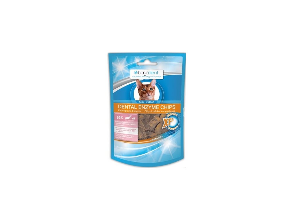 Bogadent DENTAL ENZYME CHIPS jsou chutné chipsy k čistění zubů s 92% masa. S inovativní XF3-effect-Formulou, s přírodními enzymy z koncentrované syrovátky a 2 dodatečných látek (ovocný extrakt CB90MX, minerální látky), spojují chipsy denní péči o zuby s odměnou. Zvláštní konzistence chutných DENTAL ENZYME CHIPS čistí zuby dodatečně při žvýkání.