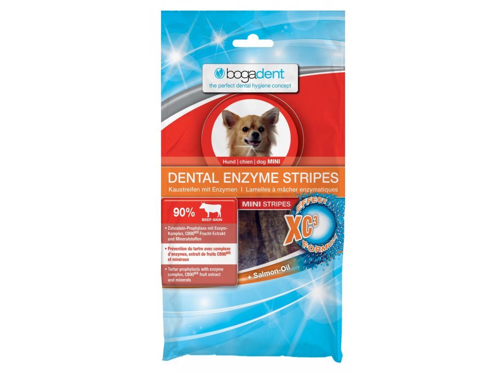 Bogadent DENTAL ENZYME STRIPES jsou ideálním řešením spojení péče o zuby a žvýkacího potěšení. Inovativní XC3-effect-Formula je založena na přírodních enzymech z koncentrované syrovátky a 2 dodatečných látkách ( ovocný extrakt CB90MX, minerální látky). Chrání před tvorbou zubního plaku a kamene a zabraňuje podráždění dásní. Obzvlášť chutná hovězí kůže DENTAL ENZYME STRIPES čistí zuby při žvýkání.