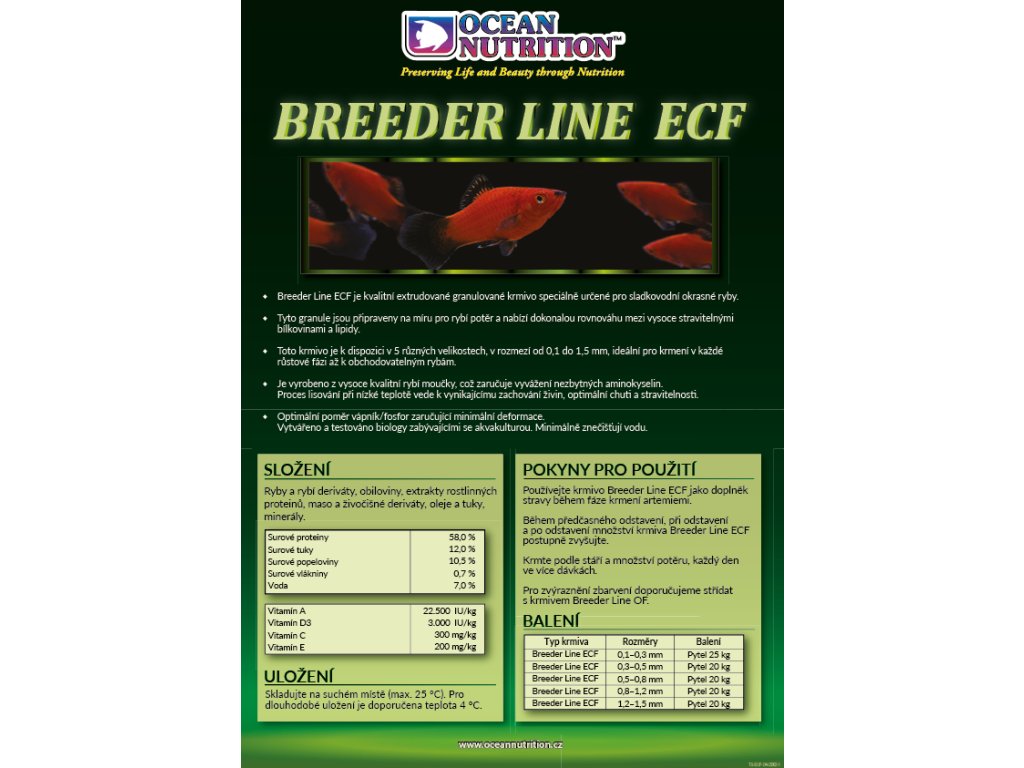 Jako součást specializovaného sortimentu krmiv Ocean Nutrition, je krmivo Ocean Nutrition Breeder Line OF základním krmivem, které bylo v průběhu let dokonale prověřeno a které má následující vlastnosti:
