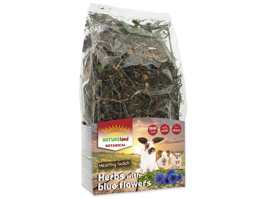 Chutný a přirozený doplněk každodenního krmiva vašeho zvířete. Toto doplňkové krmivo obsahuje sušené květy chrpy a jitrocele, také proto je bohaté na organismu prospěšné přírodní látky. Podporuje metabolismus a pomáhá regeneraci organismu po různých typech onemocnění. Díky speciálnímu postupu při sušení bylinky neztratily nic ze svých blahodárných účinků na organismus. Pečlivě vybrané složení napomáhá správné funkci zažívání králíků, morčat a drobných hlodavců. Složení: seno z horských luk 50%, sušený jitrocel 45%, sušené květy chrpy 5%.