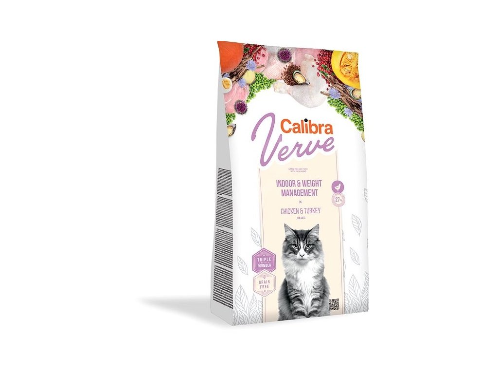 Calibra Cat Verve Indoor + Weight Management Chicken & Turkey je kompletní krmivo bez obilovin s vysokým obsahem čerstvého masa – s kuřetem a krůtou. Receptura je určená pro kočky žijící v domácnosti a také pro ty, které potřebují ohlídat váhu.