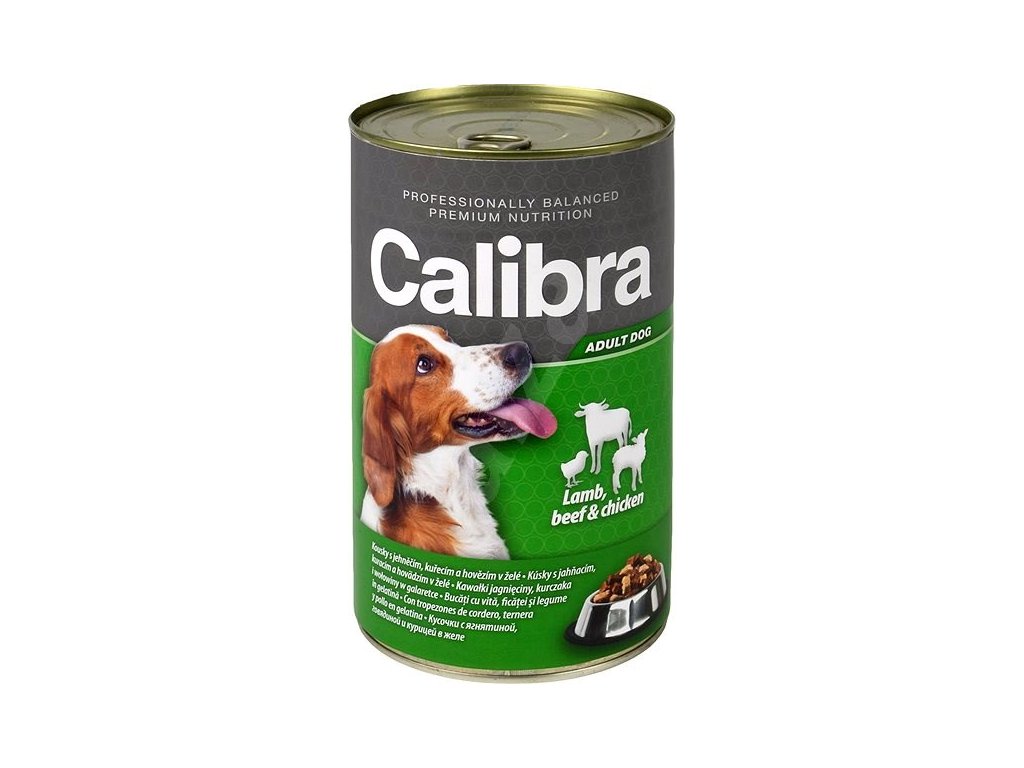 Kompletní konzervované krmivo pro dospělé psy s kousky jehněčího, kuřecího a hovězího masa v jemném želé od českého výrobce Calibra. Ideální doplněk ke granulovaným krmivům Calibra.
