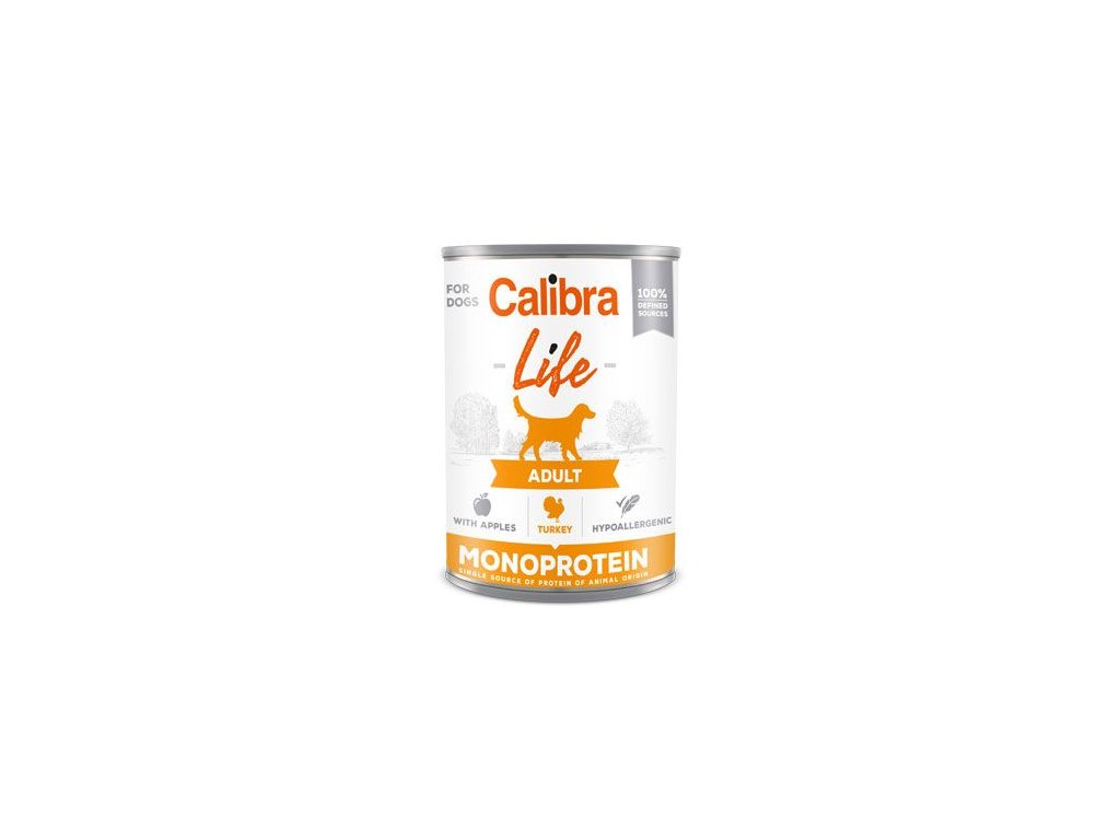 Calibra Dog Life Adult Turkey with Apples - receptura konzervy s krůtím a jablky je kompletním krmivem, které je určené pro dospělé psy.
