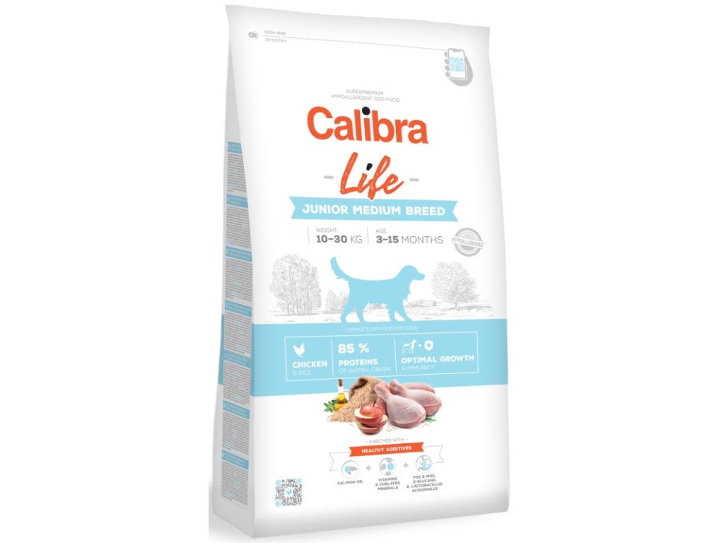 Calibra Dog Life Junior Medium Breed Chicken je hypoalergenní krmivo pro mladé psy (3–15 měsíců) středních plemen (10–30 kg) s kuřecím masem. O vysoké výživové hodnotě krmiva tolik potřebné pro správný růst psa vypovídá i obsah bílkovin živočišného původu. V této receptuře tvoří 85 % z celkového obsahu bílkovin. Receptura je sestavena jako monoproteinová - pouze jeden zdroj živočišných bílkovin. Granule jsou lehce stravitelné, s nízkým obsahem obilovin – pouze s?rýží. Díky vysoce kvalitním surovinám a pečlivě vybraným aditivům mají příznivý vliv na růst a celkový vývoj psa. Přidali jsme prebiotika a probiotika pro zdravé zažívání a posílení imunitního systému, lososový olej pro péči o zdravou kůži a zářivou srst a vitaminy a minerály pro správnou funkci celého organismu.