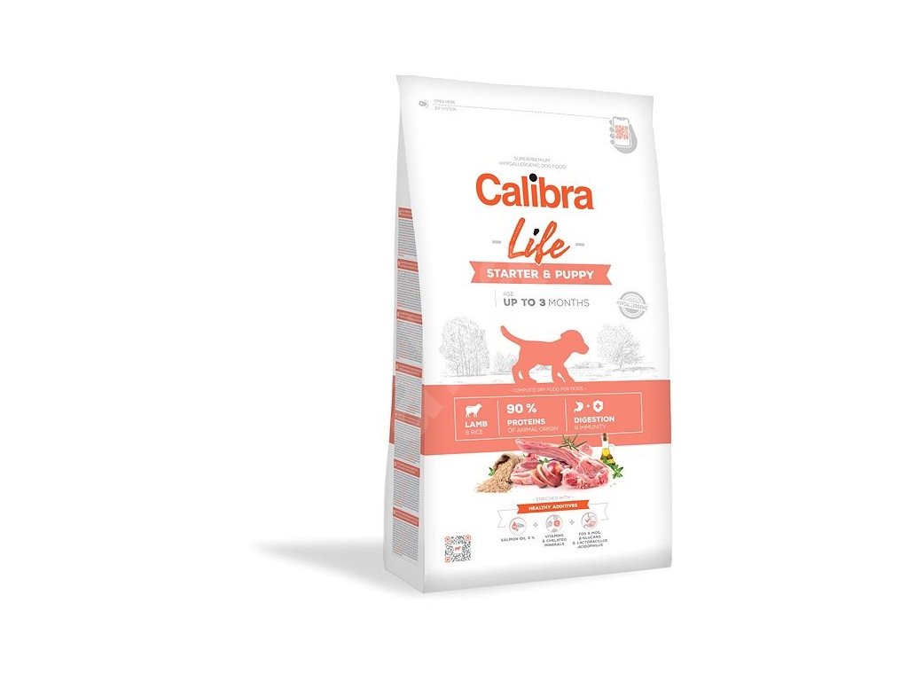 Calibra Dog Life Starter & Puppy Lamb jsou kompletní granule pro štěňata (do 3 měsíců) vhodné i pro březí nebo kojící feny. Krmivo s kvalitními jehněčími bílkovinami a nízkým obsahem obilovin zastoupenými rýží dodají nezbytné živiny během období náročného na výživu. Bílkoviny v receptuře jsou z 90 % tvořeny bílkovinami živočišného původu. Receptura je sestavena jako monoproteinová - pouze jeden zdroj živočišných bílkovin. Receptura je hypoalergenní. Pro citlivé zažívání štěňátek po odstavu je samozřejmostí vysoká stravitelnost krmiva. Prebiotika a laktobacily pomohou správnému trávení, a ty spolu s β-glukany mají zároveň příznivý vliv na posilování imunitního systému štěňátka. Kvalitní výživa je obohacena o lososový olej pro péči o kůži a srst a vybrané vitaminy a minerály pro správnou funkci a vývoj celého organismu štěněte a jeho imunitního systému.