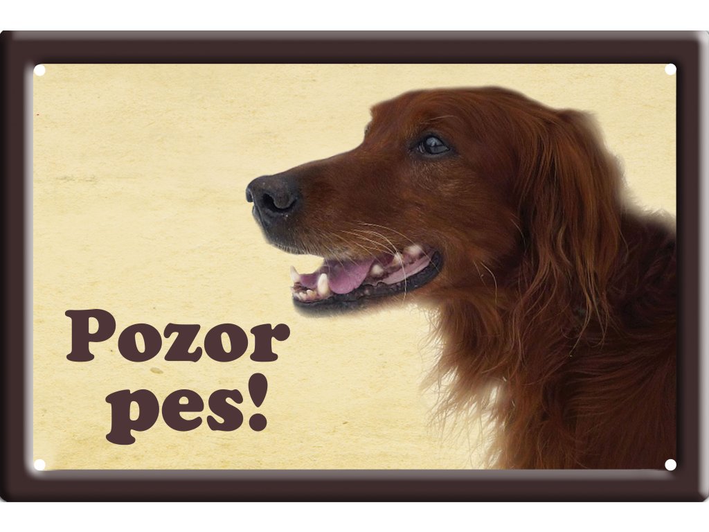 Plechová psí cedulka pro venkovní i vnitřní použití v rozměru 150x100mm, v rozích 4 díry pro uchycení, prolisovaný zdobný okraj tabulky, potištěný plech.