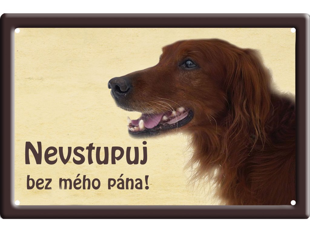 Plechová psí cedulka pro venkovní i vnitřní použití v rozměru 150x100mm, v rozích 4 díry pro uchycení, prolisovaný zdobný okraj tabulky, potištěný plech.
