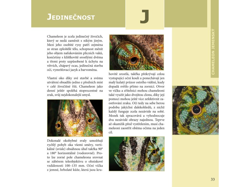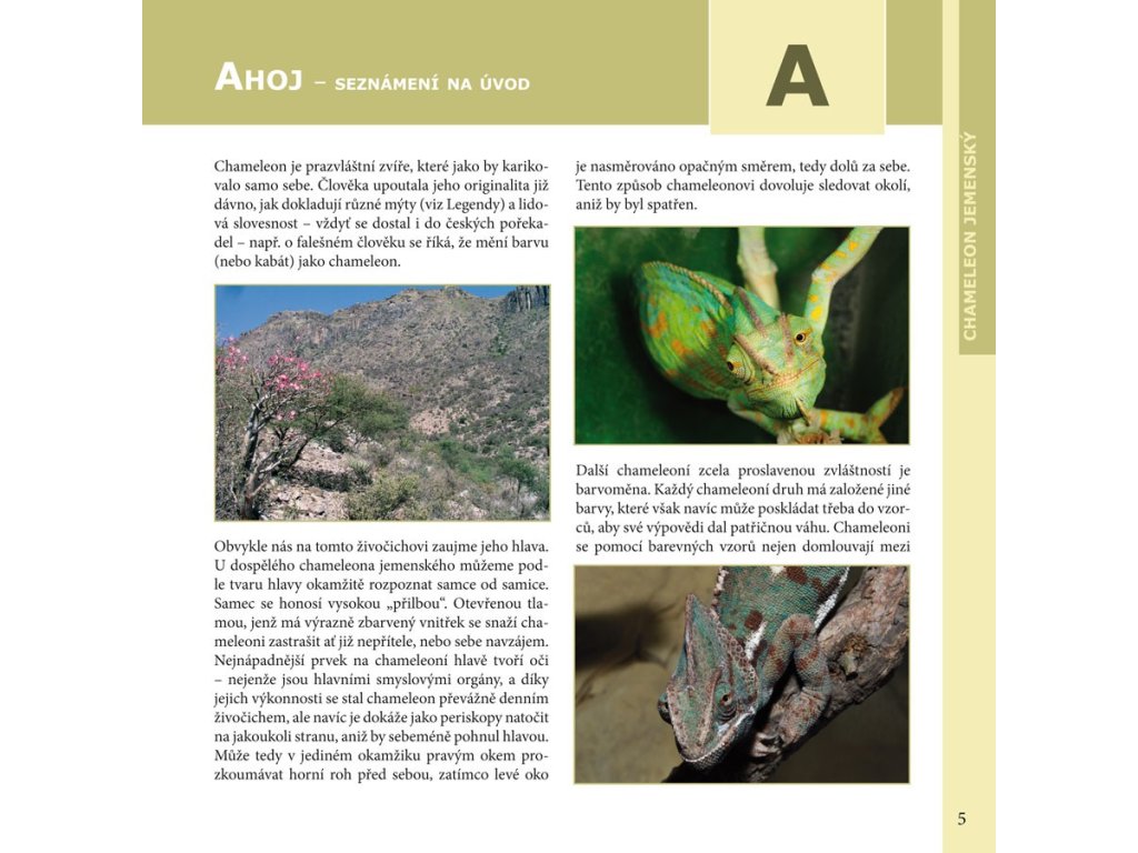 Chameleon jemenský - Chameleo calyptratus je v současné době často chované a snadno dostupné terarijní zvíře. Ne každý si uvědomí, že chameleoni pochází z úplně jiných klimatických podmínek a potřebují speciální terárium a specifickou péči. Právě proto je zde tato knížka, která Vás podrobně s tímto druhem seznámí. V kapitolách, které jsou řazeny podle abecedních hesel, je popsána základní péče, rozmnožování, chov mláďat, zdraví, vztah k člověku a různé zajímavosti. Vše je doplněné množstvím barevných fotografií a obrázků. Zkrátka zde naleznete vše potřebné pro úspěšný chov a odchov těcho velmi zajímavých zvířat.