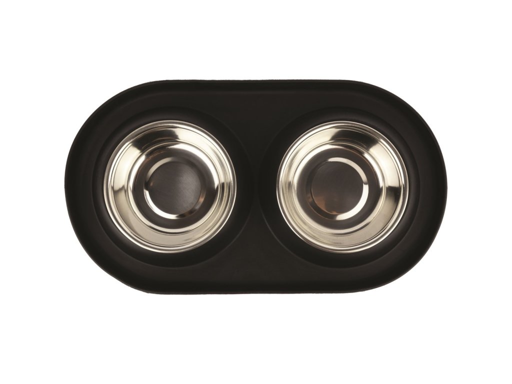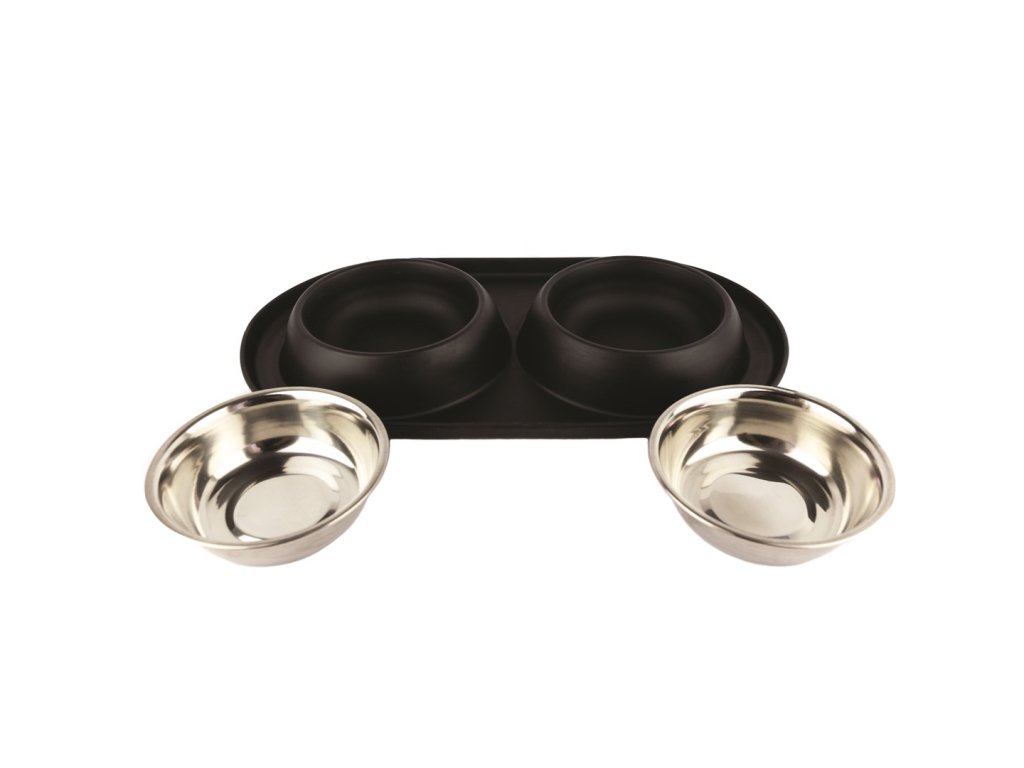 Dvojitá kovová miska Have a Pet je praktickým řešením pro každodenní krmení psů a koček. Je vyrobena z odolné, bezpečné a snadno čistitelné nerezové oceli. Každá miska je umístěna na černé plastové základně pokryté gumou, která pomáhá udržovat okolí krmiva čisté a zabraňuje jeho klouzání po podlaze. K dispozici ve dvou objemech - 2x220 ml a 2x480 ml.