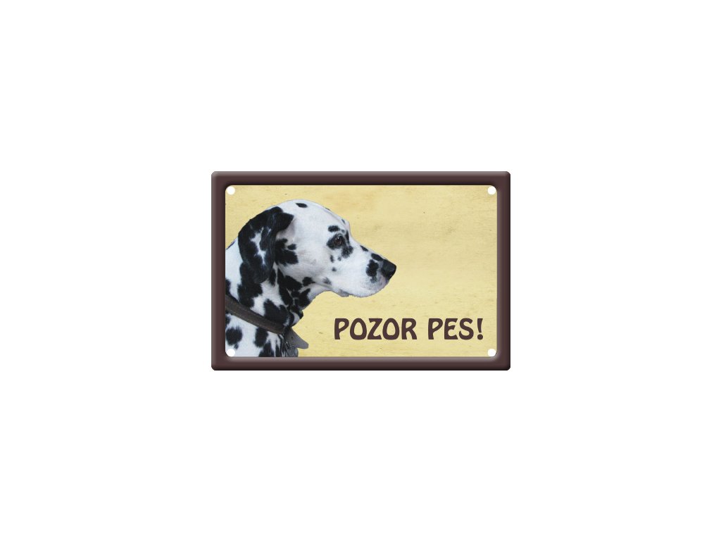 Plechová psí cedulka pro venkovní i vnitřní použití v rozměru 150x100mm, v rozích 4 díry pro uchycení, prolisovaný zdobný okraj tabulky, potištěný plech.