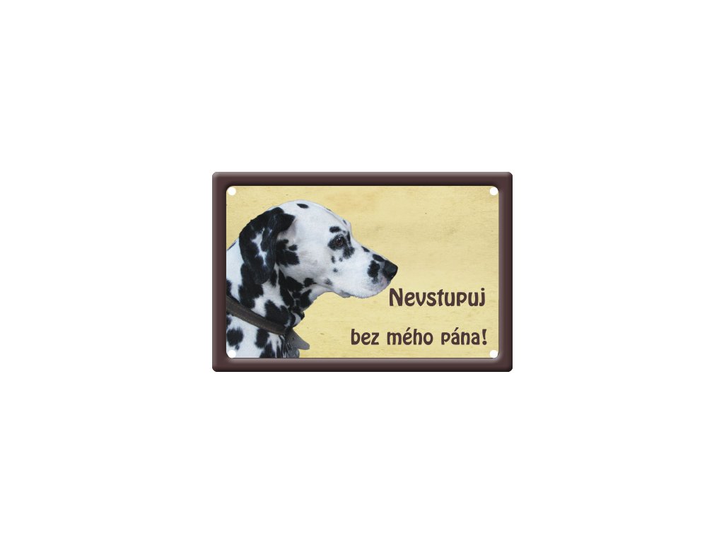 Plechová psí cedulka pro venkovní i vnitřní použití v rozměru 150x100mm, v rozích 4 díry pro uchycení, prolisovaný zdobný okraj tabulky, potištěný plech.