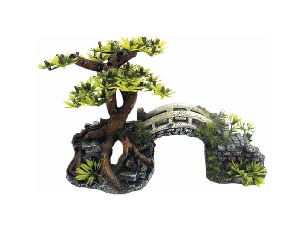 Dekorace do akvária německé značky Nobby. Kamenný most s bonsají a rostliny.