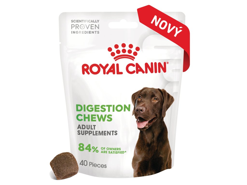 ROYAL CANIN® Digestion Chews Adult Supplements jsou funkční pamlsky pro psy, které podporují zdravé trávení a vyváženou střevní mikroflóru. Obsahují beta-glukany (postbiotika) pro správnou funkci střev a kvalitní stolici a prebiotika pro udržení vyrovnané střevní flóry. Podle interní studie společnosti Royal Canin bylo 84 % majitelů spokojených již po 2 týdnech užívání.