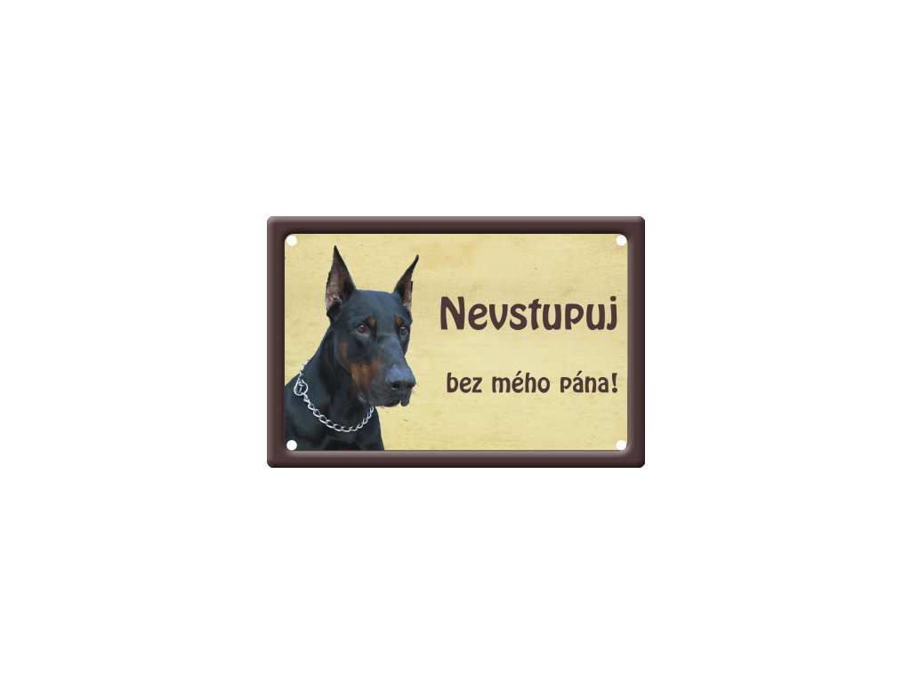 Plechová psí cedulka pro venkovní i vnitřní použití v rozměru 150x100mm, v rozích 4 díry pro uchycení, prolisovaný zdobný okraj tabulky, potištěný plech.