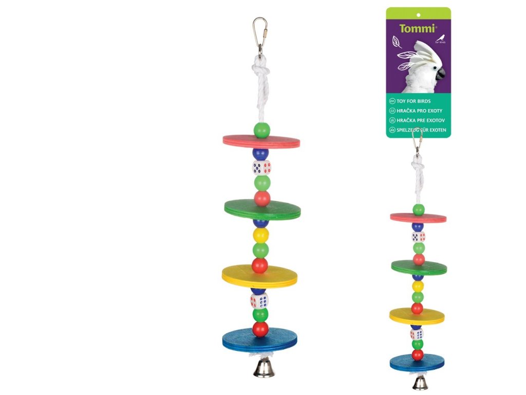 Dřevěná hračka, lano s korálky, kostkami, disky a zvonkem, které je vhodná pro velké exoty.