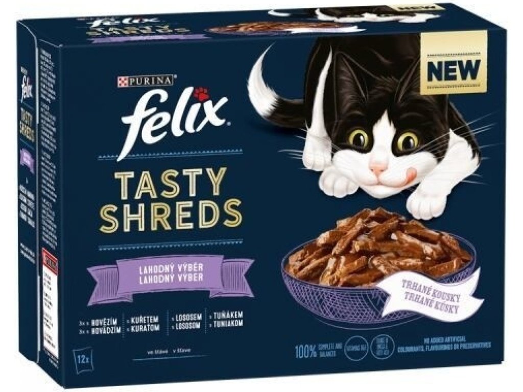 Felix Tasty Shreds lahodný výběr s hovězím, kuřetem, lososem, tuňákem ve šťávě 12 x 80g. Kompletní krmivo pro dospělé kočky. FELIX® Shreds jsou jemné a neodolatelné trhané kousky v lahodné šťávě. Kompletní krmivo pro dospělé kočky.