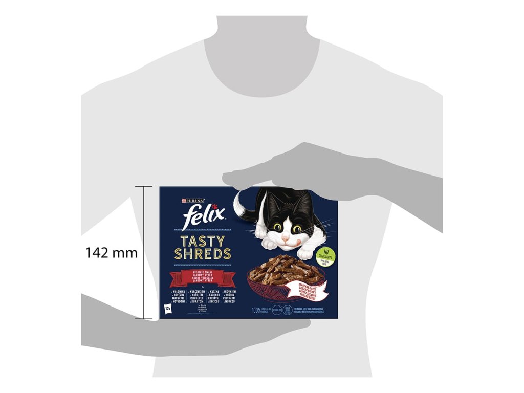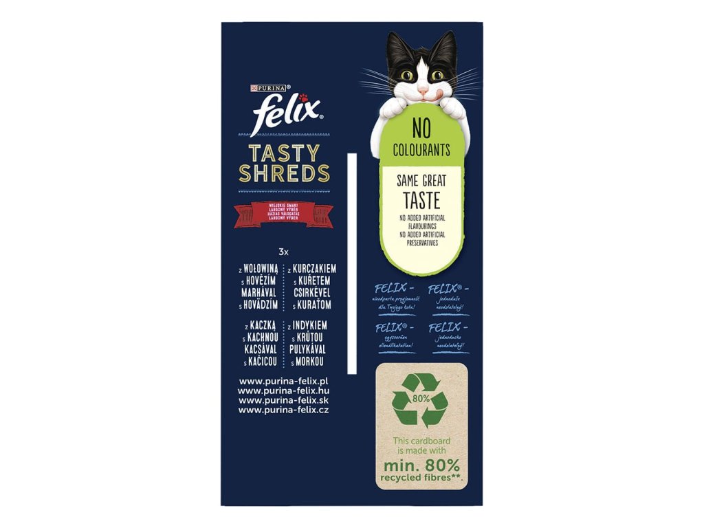 FELIX® Tasty Shreds je řada neodolatelných krmiv, které vypadají, voní a chutnají naprosto lahodně. Zároveň jsou zdrojem esenciální omega-6 mastné kyseliny a mají správnou kombinaci vitamínů, aby udržely vaši kočku plnou života a připravenou k uličnictví! Jsou plné dobrot a uspokojí 100 % denních potřeb vaší kočky, když jsou podávány podle krmného návodu.