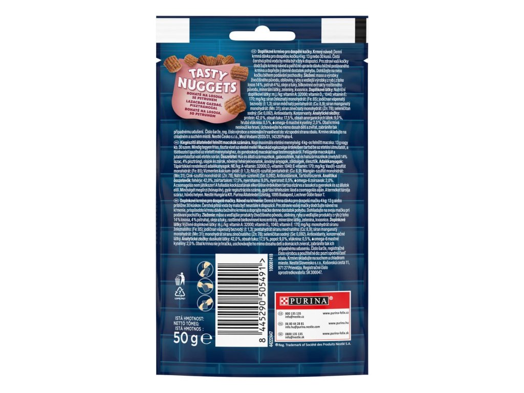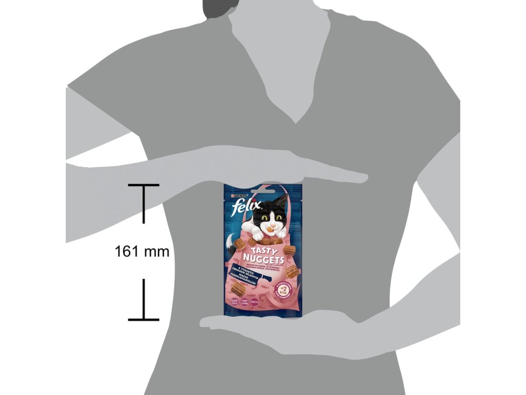 FELIX® Tasty Nuggets jsou lahodné pochoutky s vysokým obsahem bílkovin, se speciální hrubší texturou a bez barviv. Díky kombinaci dvou chutí dopřejí vaší kočce chutný okamžik a v průměru obsahují méně než 2 kcal na pamlsek. Překvapte svou kočku těmito lahodnými pochoutkami s vysokým obsahem bílkovin a s vitamíny, aby byla připravena na další zábavu.
