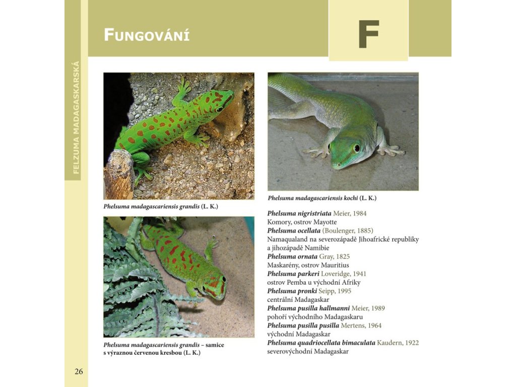 Další titul naší řady Abeceda teraristy se opět věnuje jedinému druhu, kterým je velice oblíbená Felsuma madagaskarská - Phelsuma madagascariensis. Tento velmi zajímavý plaz je přizpůsobivý a po nastudování základních informací se hodí i pro začínajícího chovatele. Zde najdete jak základní informace, které jsou nutné k úspěšnému chovu, tak i mnoho zajímavostí, doplňujících informací a barevných fotografií. Kniha je přehledně rozdělena do kapitol, ve kterých je věnována pozornost základní péči, rozmnožování, chovu mláďat, možným komplikacím v chovu, vztahu k člověku, biologii druhu atd... Své si zde najdou začátečníci i zkušení chovatelé.