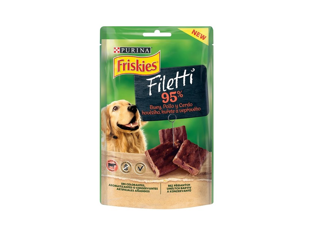 Friskies Filetti hovězí jsou delikátní, lahodné a křehké* pochoutky bohaté na hovězí, kterým váš pes neodolá. Chutné a jemné pochoutky, vyrobené bez přidaných umělých barviv a konzervantů, které jsou vhodné pro všechny druhy psů a každou denní dobu.
