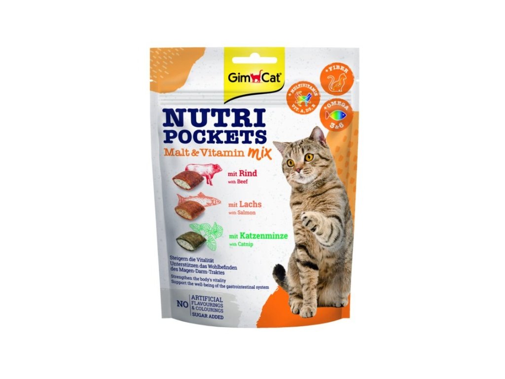 Doplňkové krmivo pro kočky Gimcat nutri pockets malt-vitamin mix jsou směsí křupavých kapsiček s lahodnou náplní. Skládá se z nutri pocket s catnipem a multivitaminem, nutri pocket s hovězím masem a maltózou a nutri pocket s lososem a omega 3 a 6.