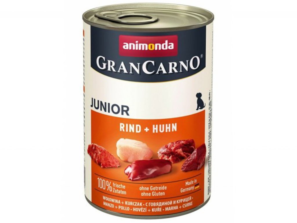 Kompletní krmivo pro štěňata a dorůstající psy. Konzervy GranCarno Junior jsou vyráběny výhradně z čerstvého masa. Konzervy obsahují ANI-Protect přírodní antioxidanty, které chrání imunitní systém a podporují odolnost.