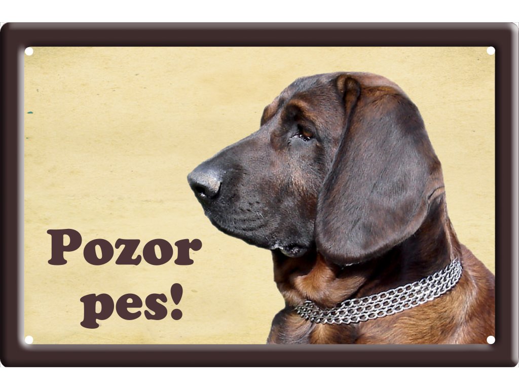 Plechová psí cedulka pro venkovní i vnitřní použití v rozměru 150x100mm, v rozích 4 díry pro uchycení, prolisovaný zdobný okraj tabulky, potištěný plech.