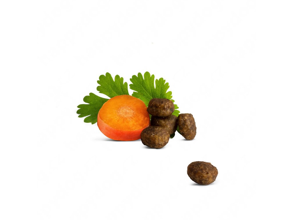 živočišný protein* (29,5 % drůbež), kukuřice, oleje a tuky, rýže, rýžový protein*, škvarky, lososová moučka, hydrolyzovaný protein*, lignocelulóza (1,7 %), cukrovkové řízky* (odcukřené), chlorid draselný, vejce celá sušená, droždí*, chlorid sodný, jablečná dřeň* (0,35 %), mrkev* (0,2 %), mořské řasy*, lněné semeno (0,15 %), čekanka (0,15 % = 0,1 % inulin), juka schidigera* (0,04 %), ostropestřec mariánský, droždí* (extrahované, 0,02 % = 0,0032 % MOS), artyčok, pampeliška, zázvor, bříza kopřiva, heřmánek, koriandr (0,008 %), rozmarýn, šalvěj, kořen lékořice, tymián (sušené bylinky celkem: 0,16 %); *) sušené.