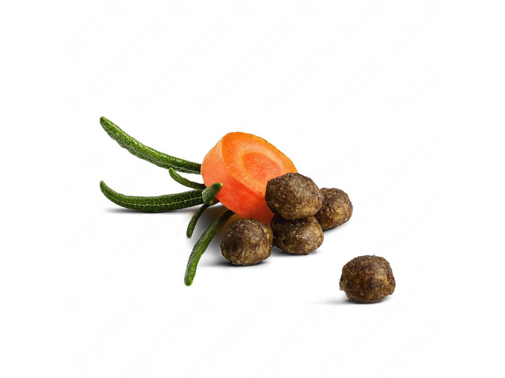 živočišný protein* (33 % drůbež), kukuřičná mouka, oleje a tuky, rýže, škvarky, rýžový protein*, lososová moučka (4 %), hydrolyzovaný protein*, lignocelulóza, cukrovkové řízky* (odcukřené), chlorid draselný, droždí*, vejce celá sušená, chlorid sodný, jablečná dřeň* (0,4 %), mrkev* (0,2 %), mořské řasy*, lněné semeno (0,16 %), čekanka (0,15 % = 0,1 % inulin), juka schidigera* (0,04 %), ostropestřec mariánský, droždí* (extrahované, 0,02 % = 0,0032 % MOS), artyčok, pampeliška, zázvor, bříza, kopřiva, heřmánek, koriandr, rozmarýn (0,008 %), šalvěj, kořen lékořice, tymián (sušené bylinky celkem: 0,16 %); *) sušené.