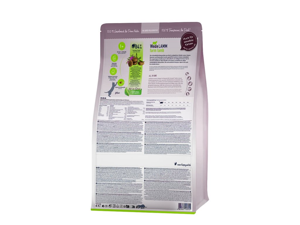 Receptura Happy Cat Sterilised Weide-Lamm byla vyvinuta speciálně pro kastrované kočky. Vyvážená výživa je chutná, sytící a obsahuje pouze 10,5 % tuku.
