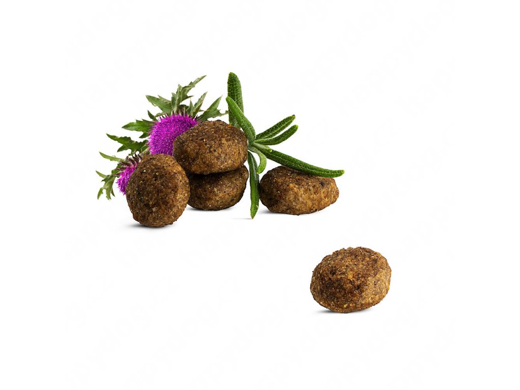 živočišný protein* ( drůbež), škvarky, jehněčí protein* (9 %), rýže, kukuřice, kukuřičná mouka, brambory*, lignocelulóza, oleje a tuky, rýžový protein*, hydrolyzovaný protein*, cukrovkové řízky* (odcukřené), jablečná dřeň* (0,8 %), chlorid draselný, droždí*, chlorid sodný, vejce celá sušená, mořské řasy*, lněné semeno (0,16 %), čekanka (0,15 % = 0,1 % inulin), juka schidigera* (0,1 %), maso mořských mušlí* (0,05 %), ostropestřec mariánský (0,024 %), droždí* (extrahované, 0,02 % = 0,0032 % MOS), artyčok, pampeliška, zázvor, list břízy, kopřiva, heřmánek, koriandr, rozmarýn (0,008 %), šalvěj, kořen lékořice, tymián (sušené bylinky celkem: 0,16 %); *) sušené.