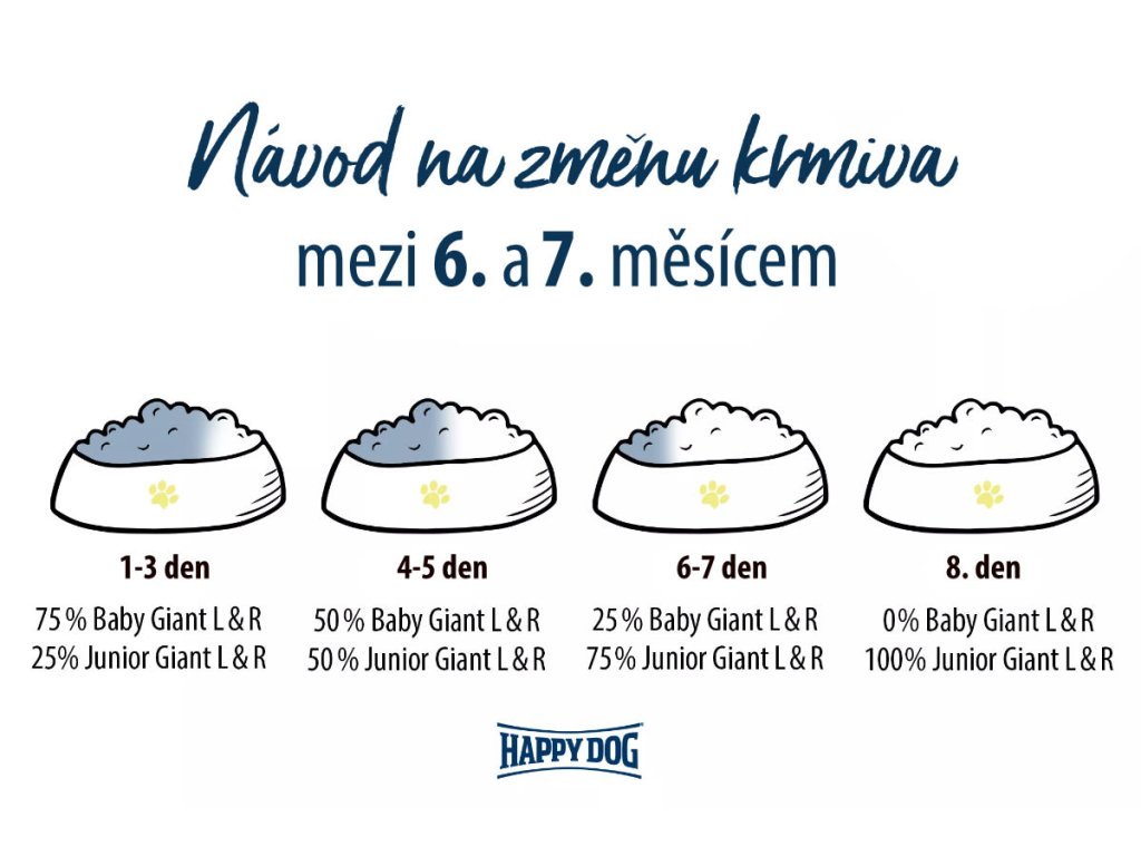 Od 27. týdne života je potřeba štěně postupně převést na pokračující krmivo Junior Giant Lamb & Rice, určené pro mladé psy (2. fáze).