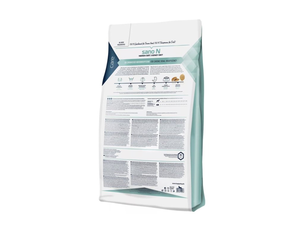 Happy Dog Sano N se používá k podpoře funkce ledvin při chronické ledvinové nedostatečnosti. Toto dietní krmivo se vyznačuje těmto potřebám speciálně přizpůsobeným obsahem lehce stravitelných bílkovin a taktéž fosforu a sodíku. Mimořádně chutná receptura obsahuje jako zdroj bílkovin vejce, lososa a škvarky.
