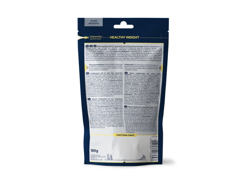 Psi, kteří mají sklony k nadváze, se již nemusí obejít bez pamlsků. Happy Dog Care Snack Healthy Weight byl speciálně vyvinut pro efektivní podporu moderování hmotnosti psa. Nízkotučné psí pamlsky s přídavkem L-karnitinu lze snadno začlenit do dietního plánu vašeho psa a přitom jsou mimořádně chutné. Měkké bonbóny tohoto funkčního pamlsku se snadno používají a taky se perfektně dávkují. Naše pamlsky jsou vyrobeny v Německu bez přidaného cukru a bez umělých aromat, barviv a konzervantů.