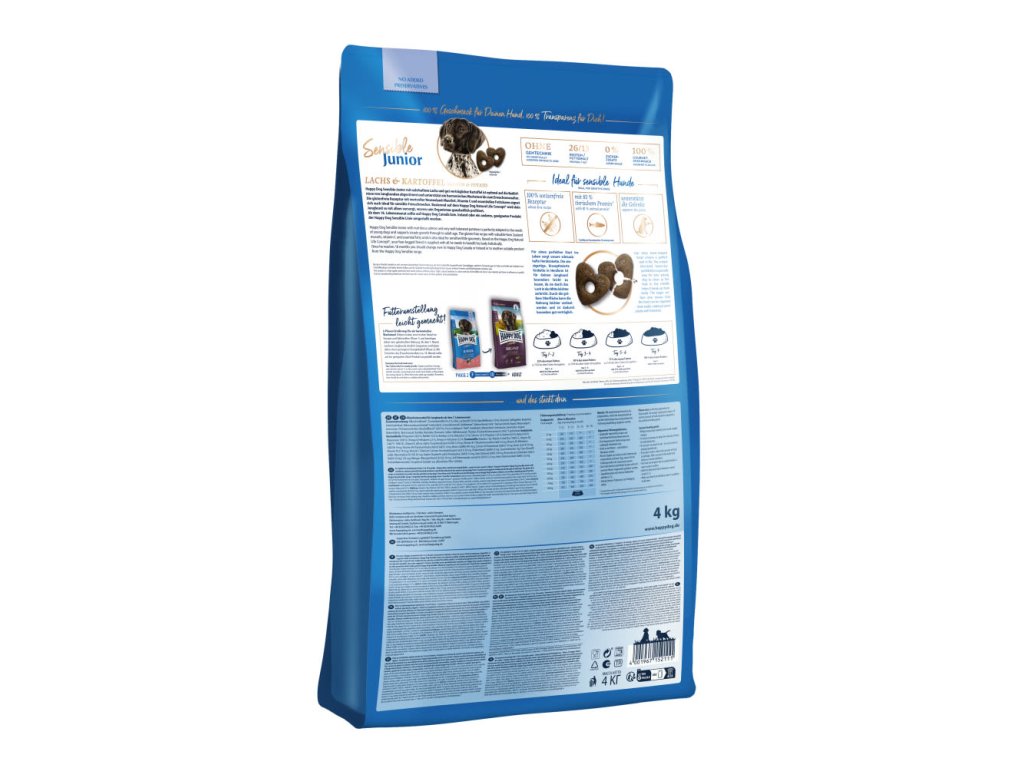 Krmivo Happy Dog Sensible Junior s výživným lososem a dobře snášenlivými brambory je ideálně přizpůsobeno potřebám mladých psů od 7. měsíce a podporuje jejich harmonický růst až do dospělosti. Recepturu bez lepku velmi dobře snášejí i citliví mladí psi. Od 18. měsíce života byste měli přejít na krmivo Happy Dog Canada nebo Ireland, nebo na jiné vhodné krmivo řady Happy Dog Sensible.