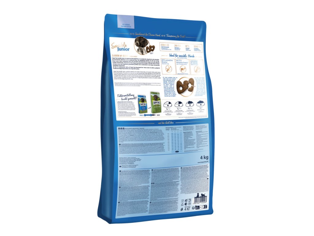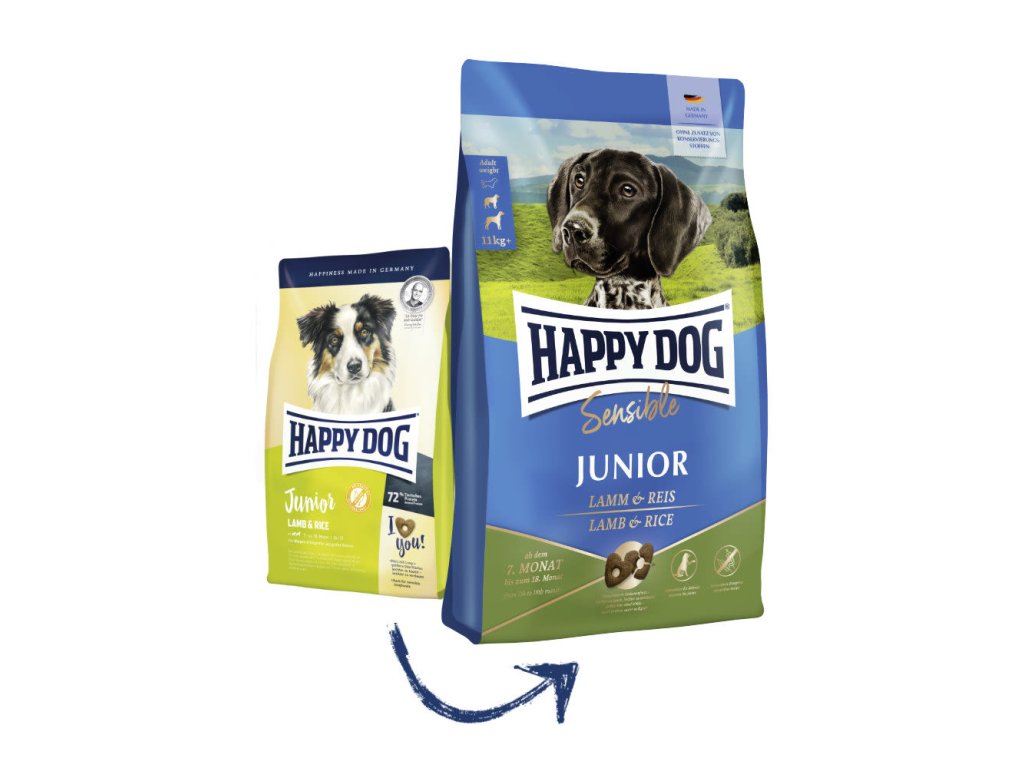 Krmivo Happy Dog Sensible Junior s dobře snášenlivým jehněčím masem a snadno stravitelnou rýží je ideálně přizpůsobeno potřebám mladých psů od 7. měsíce a podporuje jejich harmonický růst až do dospělosti. Recepturu bez drůbežího masa a lepku velmi dobře snášejí i citliví mladí psi. Od 18. měsíce života byste měli přejít na krmivo Happy Dog Neuseeland nebo Greece, nebo na jiné vhodné krmivo řady Happy Dog Sensible.