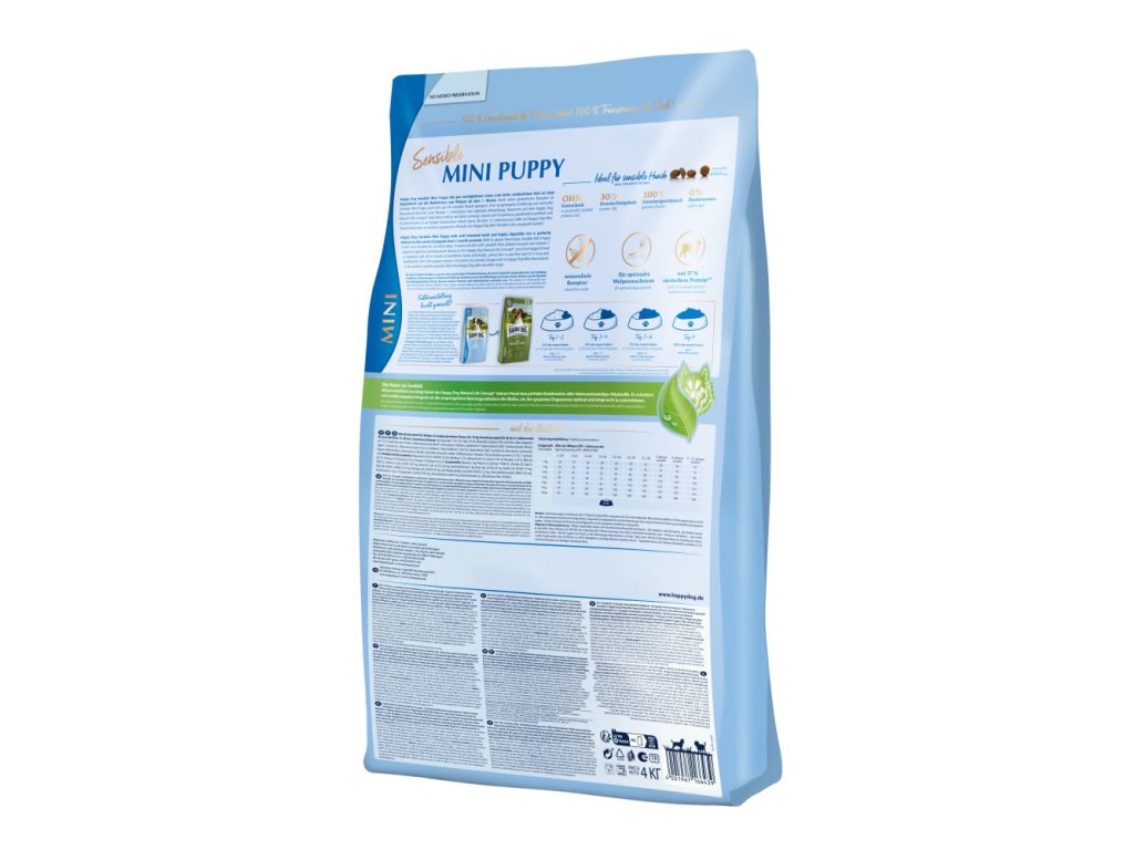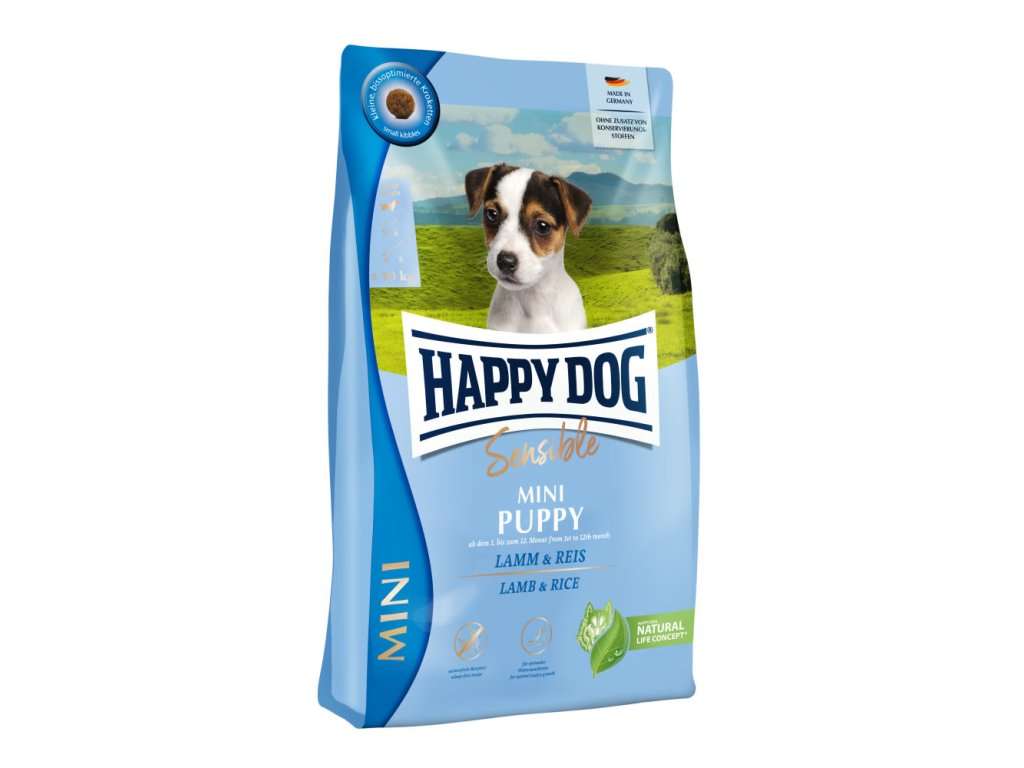 Krmivo Happy Dog Sensible Mini Puppy & Junior s dobře snášenlivým jehněčím masem a snadno stravitelnou rýží je ideálně uzpůsobeno potřebám štěňat od 1. měsíce života a podporuje jejich optimální vývoj. Bezlepkovou recepturu velmi dobře snášejí i citlivá štěňata.