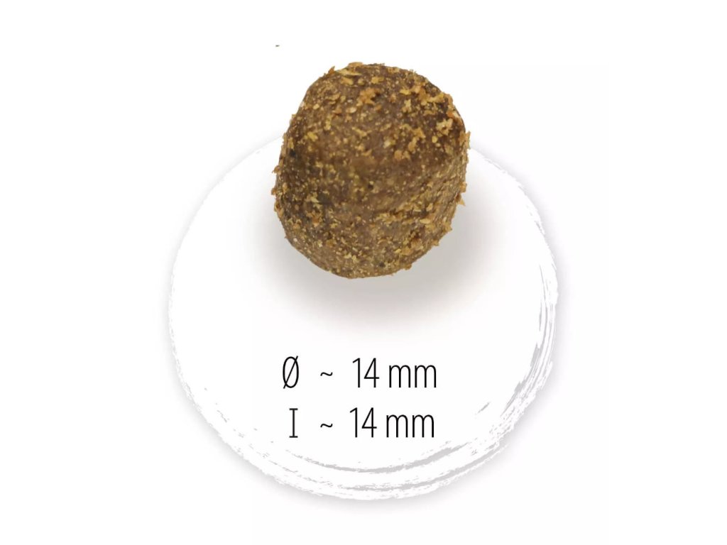 drůbeží protein* (23%), rýžová mouka (16%), celozrnná kukuřice, kukuřičná mouka, celozrnný ječmen, drůbeží tuk, cukrovkové řízky* (odcukřené), játrový hydrolyzát, jablečná dřeň* (1,3%), slunečnicový olej (0,8%), hovězí lůj, droždí*, chlorid draselný, řepkový olej (0,2%), mrkev*, chlorid sodný, zelený oves*, slunečnice*, řeřicha*, petržel*, (zelené byliny celkem: 0,3%); *) sušené. Stravitelná energie: 1.620 KJ/100g; 3.870 Kcal/kg
