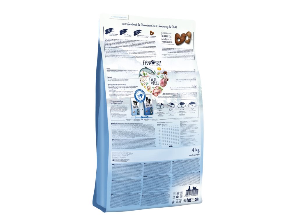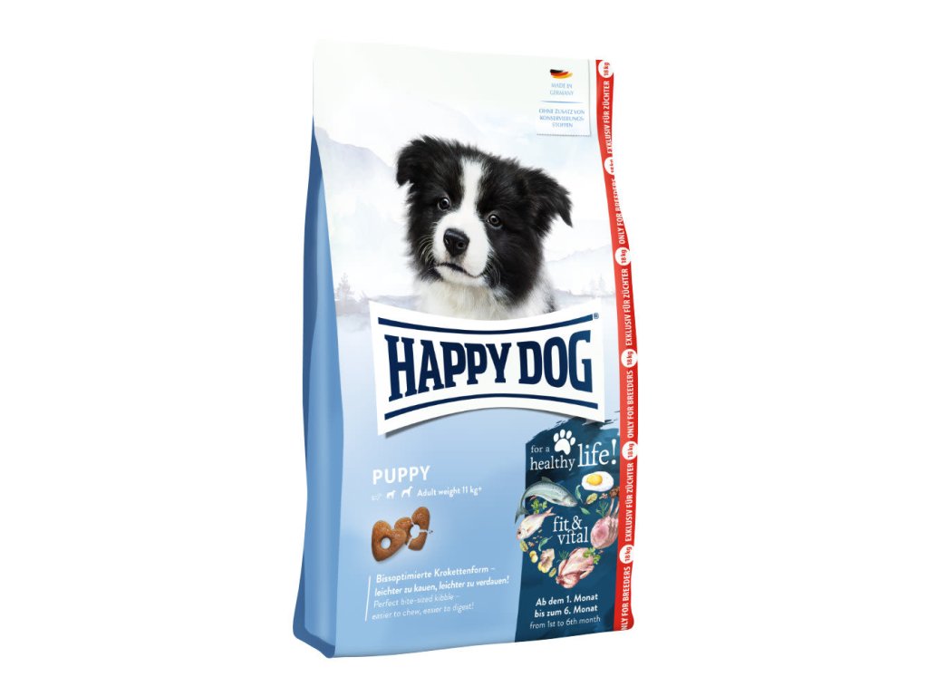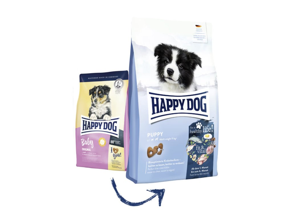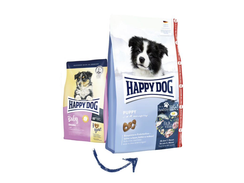 Krmivo Happy Dog fit & vital Puppy s recepturou bez pšenice je optimálně přizpůsobeno potřebám štěňat od 1. měsíce a podporuje jejich optimální vývoj. Od 7. měsíce života byste měli přejít na krmivo Happy Dog fit & vital Junior.