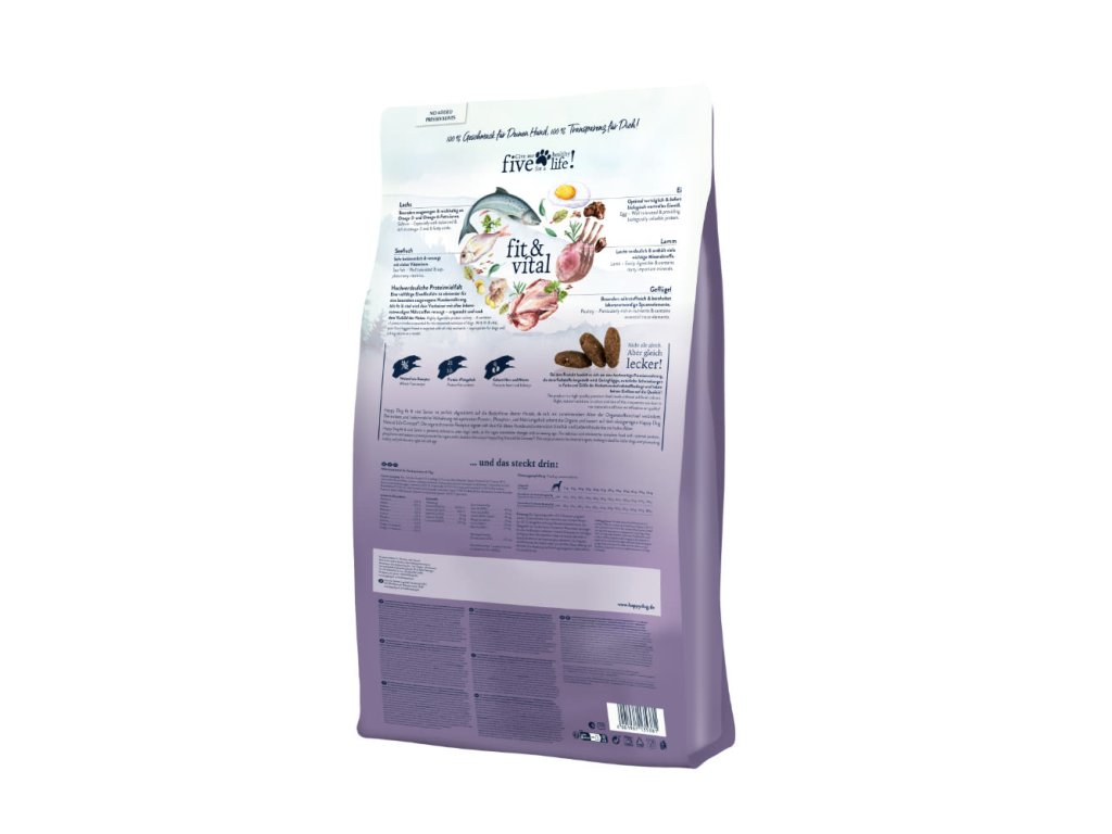 živočišné bílkoviny* (9 % drůbeží, 4 % jehněčí), rýže, rýžová mouka, kukuřice, kukuřičná mouka, ječmen, rybí moučka (4 %, z toho 50 % lososová moučka), škvarky, drůbeží tuk, játrový hydrolyzát, slunečnicový olej, cukrovkové řízky* (odcukřené), jablečná dřeň*, chlorid draselný, řepkový olej, droždí*, chlorid sodný, mořské řasy*, lněné semeno (0,16 %), vejce celá* (0,12 %), kořen čekanky* (extrahovaný) (0,05 %), maso z mušlí* (0,02 %), droždí* (extrahované), ostropestřec mariánský, artyčok (0,013%), pampeliška, zázvor (0,013%), list břízy, kopřiva, heřmánek, koriandr, rozmarýn, šalvěj, kořen lékořice, tymián; (bylinky* celkem: 0,16 %), (* sušené).